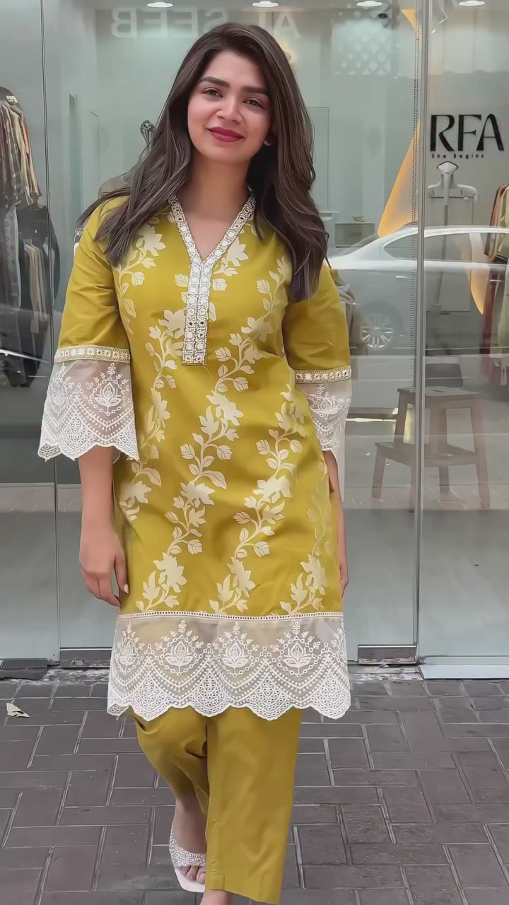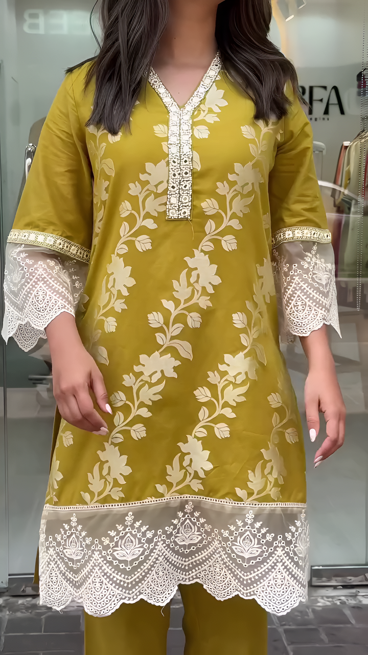Work:- mirror work on neck and embrodairy lace on sleeves and daman.